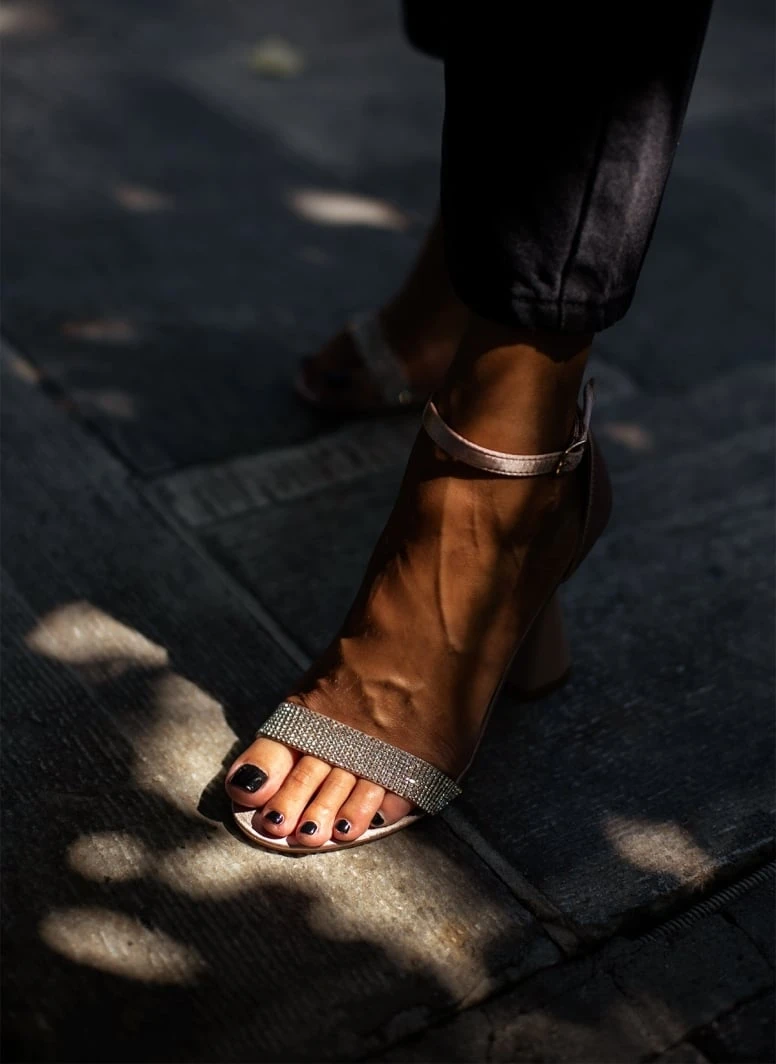 Πέδιλα σατέν με τακούνι καμπάνα. Έχουν strass φάσα. Η φτέρνα είναι κλειστή. Δένουν με μπαρέτα στο ύψος του αστραγάλου.
