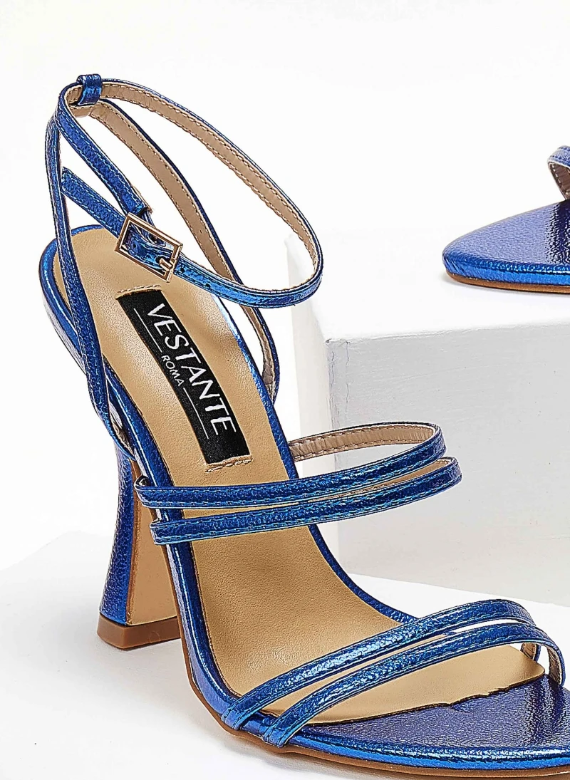 Πέδιλα σε μεταλλικά χρώματα με λεπτά λουράκια. Δένουν με μπαρέτα στο ύψος του ατσραγάλου.