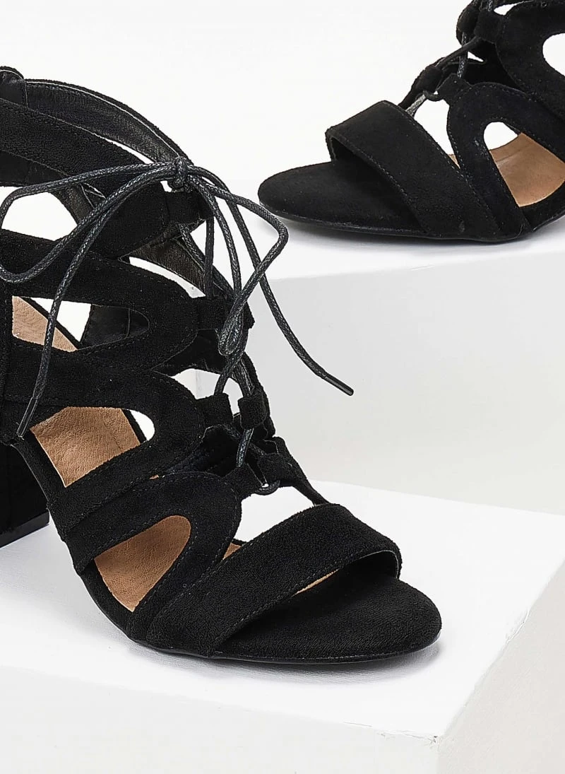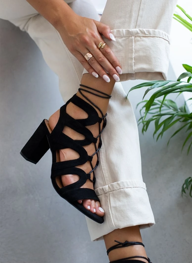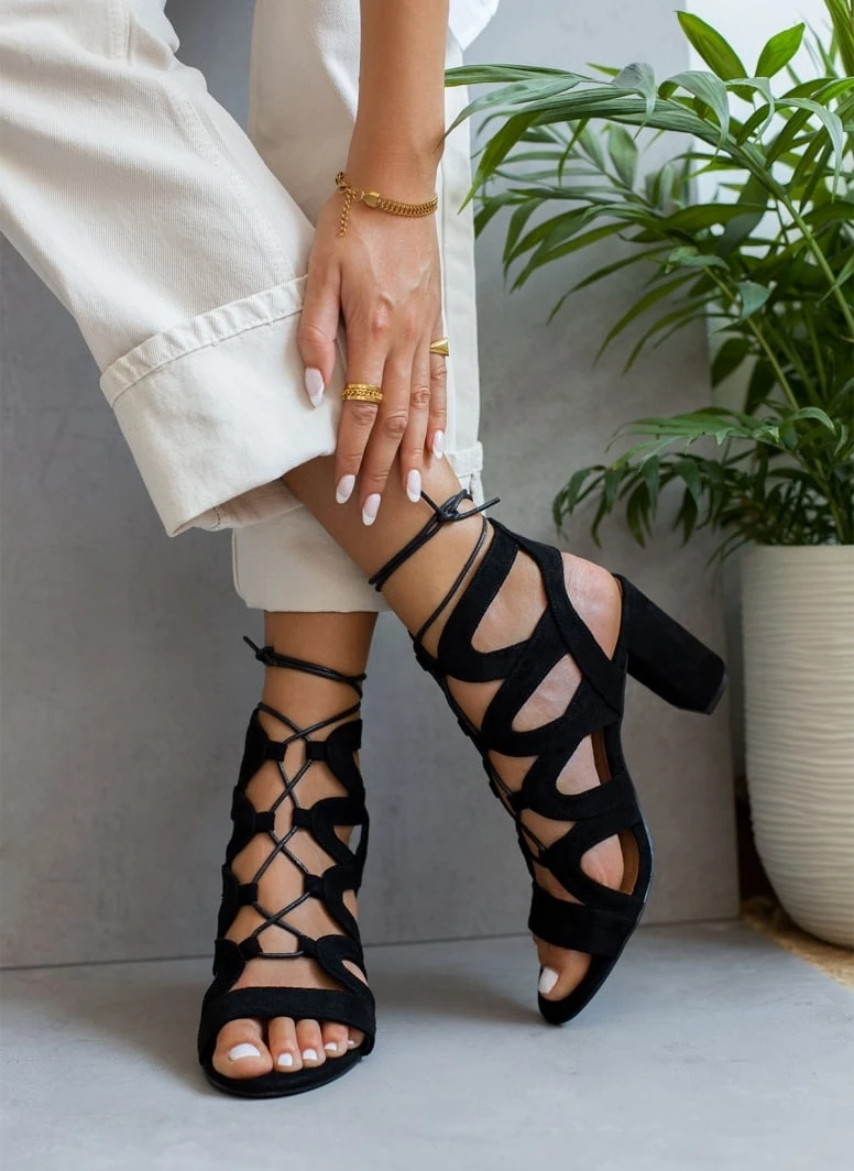 Πέδιλα μποτάκια suede με κορδόνια. Ψηλό χοντρό τακούνι. Δένουν στο ύψος του αστραγάλου. Στρογγυλή γραμμή.
