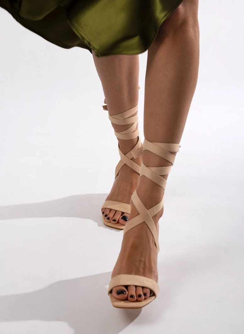 Πέδιλα suede με δέσιμο στη γάμπα.Έχουν λεπτή φάσα και ψηλό τετράγωνο τακούνι.