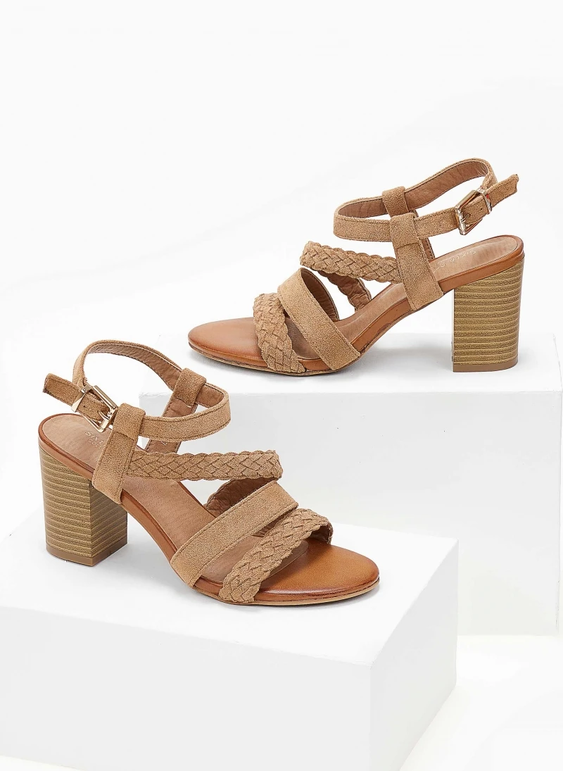 Πέδιλα suede με πλεκτό σχέδιο στα λουράκια. Έχουν χοντρό ξύλινο τακούνι. Δένουν στο πλάι με λουράκι. Στρογγυλή γραμμή.