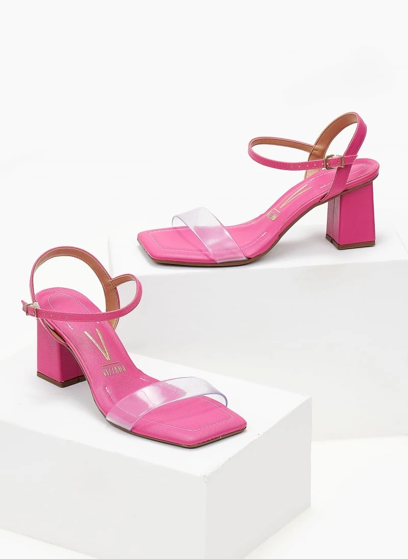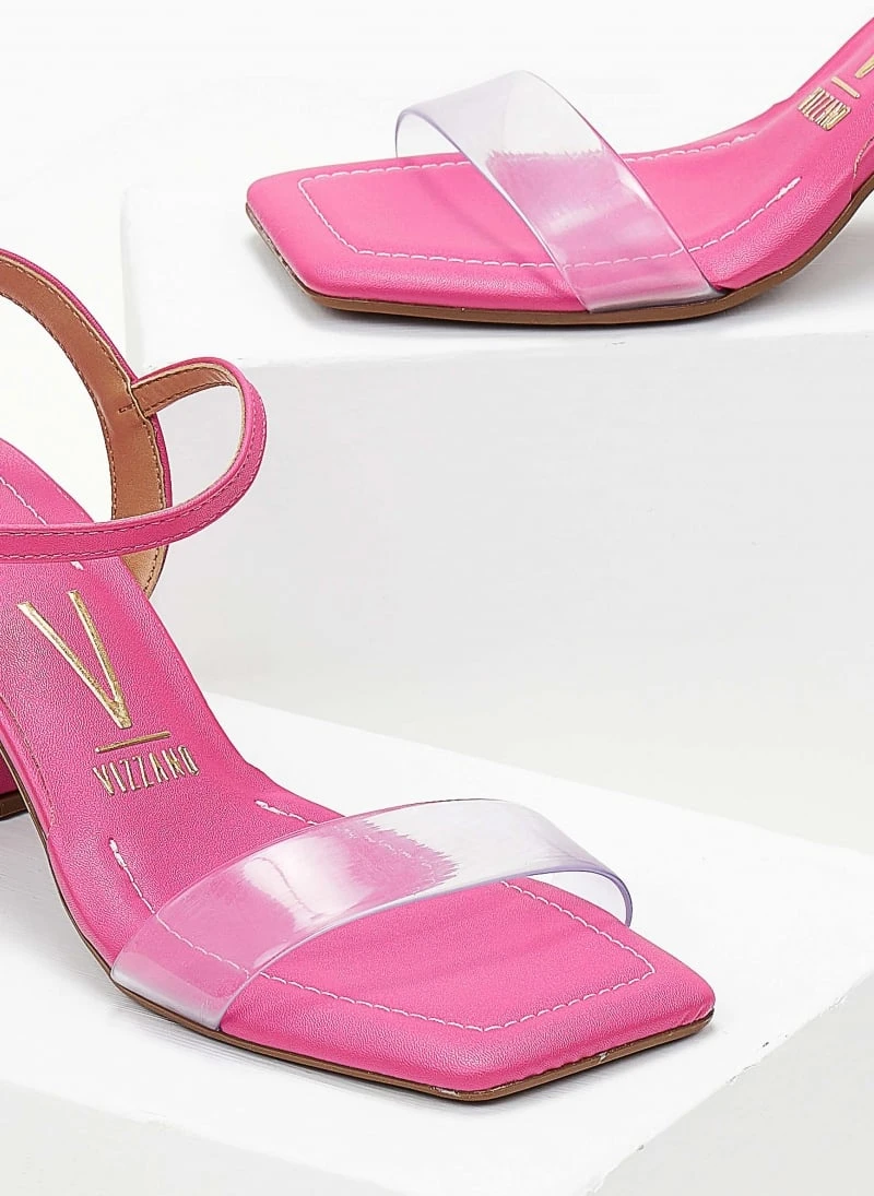 Πέδιλα VIZZANO με χαμηλό χοντρό τακούνι. Έχουν φάσα διαφάνεια. Δένουν με μπαρέτα στο ύψος του κουτεπιέ. Καρέ γραμμή. Διαθέτουν ανατομικό μαξιλαράκι στον πάτο. Σόλα αντιολισθητική με λάστιχο.